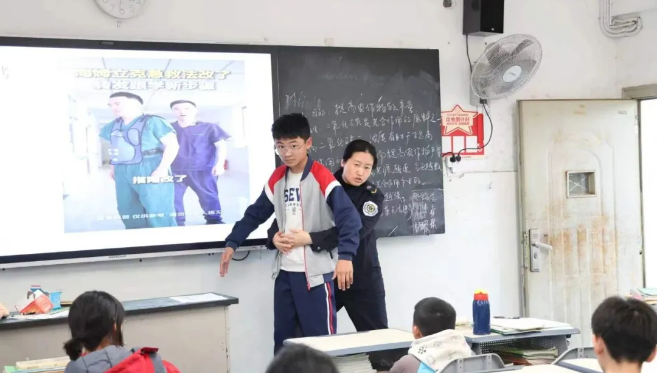 针对初中生群体的认知特点,讲师以 “剪刀、石头、布” 三步口诀简化操作:两指置于脐上两横指处,握拳抵住,另一手包拳快速向内向上冲击腹部,直至异物排出。朗朗上口的口诀让同学们瞬间领悟了操作核心,不少同学当场在座位上跟着比划动作。